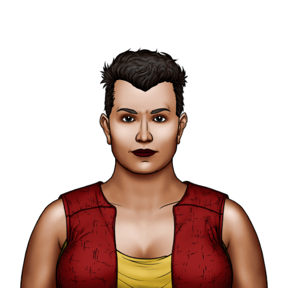 Brown skinned and brawny, Biacha is a sight to behold. She's broad shouldered and wiry, with a fairly rectangular head that gives her an almost masculine appearance. Not that she minds, she crops her hair short or styles it like a mohawk to complete her tomboyish appearance. She sports dark eyes and dark lips to go with her black hair, which help to give her airs of animosity. She likes to look tough, and makes a habit of ripping off sleeves in order to show off her arms and keep up the rough and rowdy picture.