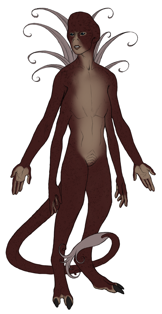 Tails are semi-prehensile and posses as soft "bulb" at the end. Tails typically match body length at a 1:1 ratio, with room for a little variation. A crest of soft spines or fronds grows from the shoulder blades and can reach several feet in length when fully extended. These fronds are soft and flexible, able to curl tightly or expand fully. Typically, fronds respond to temperature and emotion. Tightly curled fronds indicate a murdon feeling physical or mental discomfort. Fronds that are fully extended and vibrating express excitement or aggression. Fronds and tail bulbs contain a thick, nutrient-dense, semi-translucent fluid. This fluid can be used by the brain to aid in difficult mental processes. Huge bursts of psionic power often require a great deal of this fluid. A Murdon with thin/unhealthy fronds, injured fronts, or (worst of all) fronds that have been forcibly removed, are weakened and often disoriented and have trouble collecting thoughts.